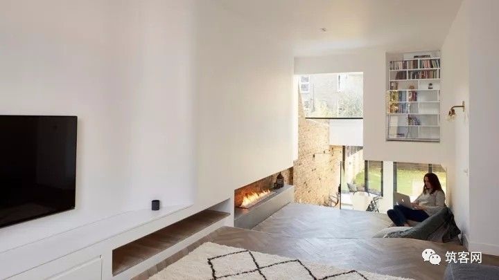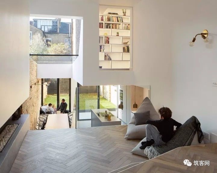 在这个维多利亚时期的老宅改造中,设计师Ben Kilburn大胆把楼板去掉,创造出一个双层高的图书入口,紧临大落地窗,让室内外融为一体。