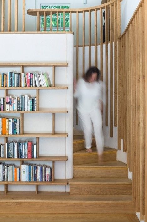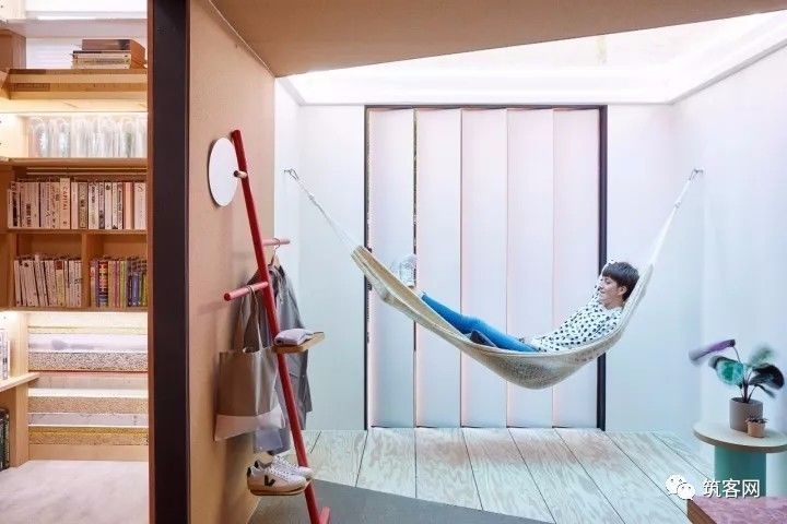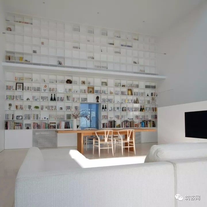 全开放式空间的家庭住宅,图书架设计成了家中的装饰,也可以作为懒人区域,通过读书,将一家人的生活系在一起。