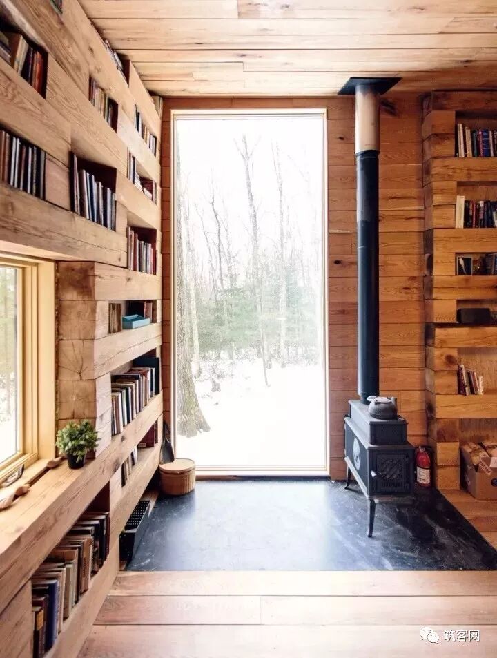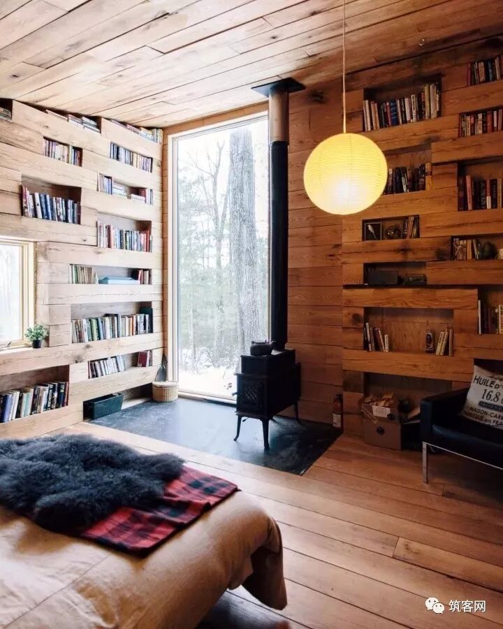 隐藏在森林中的避世小窝,统一的原木系统,书架设计自然质朴,居于其中,满是由内而外的宁静悠然。