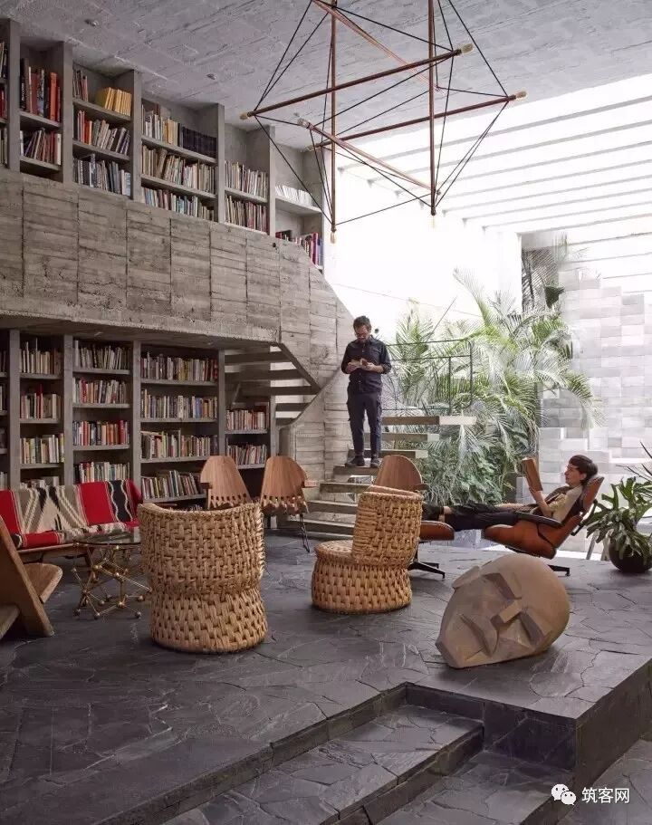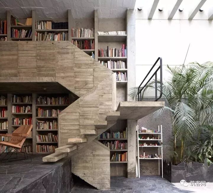 作为一个建筑师,Pedro Reyes在自己的私宅中利用水泥元素设计了一个双层高的日间动区。体积感强烈的水泥包含了楼梯,墙面和书架等,搭配绿植,引入自然光,让这个室内空间,变得更加灵动。